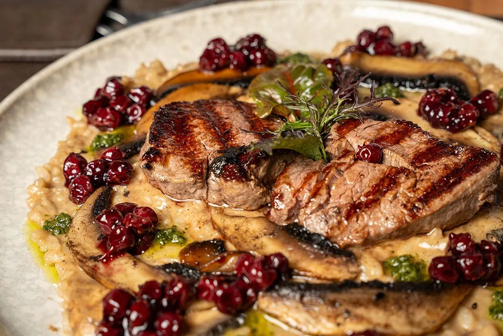 Como plato de fondo, una opción agridulce es el risotto de setas con filete y salsa de murta, fruto silvestre del sur. “Es un arroz cremoso cocinado lentamente con setas, coronado con filete de res en su punto justo y bañado en una reducción de murta que equilibra suavidad, carácter y un toque frutal”, explica Natalia. En éste y en cada plato se distingue la virtud de la comida sin prisa, hecha a fuego lento y en el momento, porque en Chiloé se vive y se cocina sin apuros.