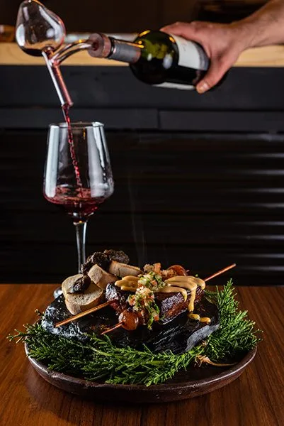 Anticucho de res en roca laja. La piedra es local, recolectada del fiordo. “Cocinar sobre roca como antes”, señala montando la preparación. Un gesto que conecta territorio e historia. La carne, madurada durante 30 días, es marinada en soya, salsa de pescado, de ostra y jengibre; ecos de un viaje a Asia en 2018 que el chef trajo al sur. El pebre quemado lleva la ceniza de la parrilla al plato: un umami que convoca a la memoria.