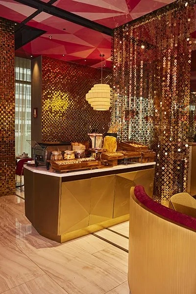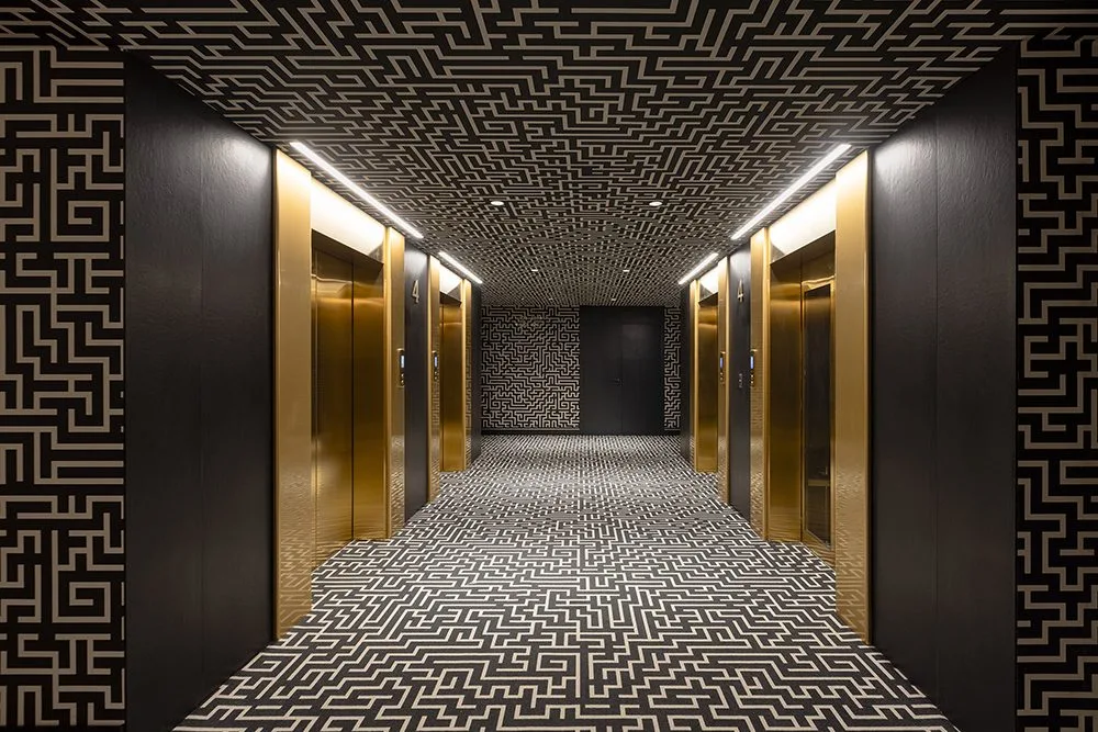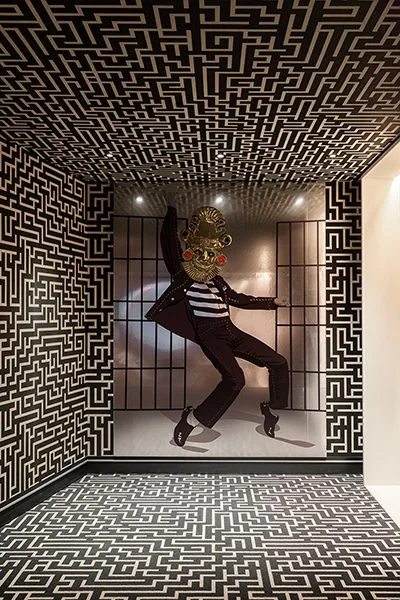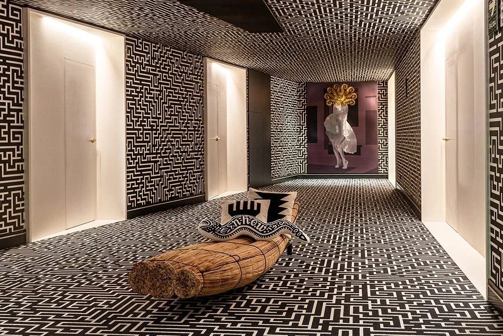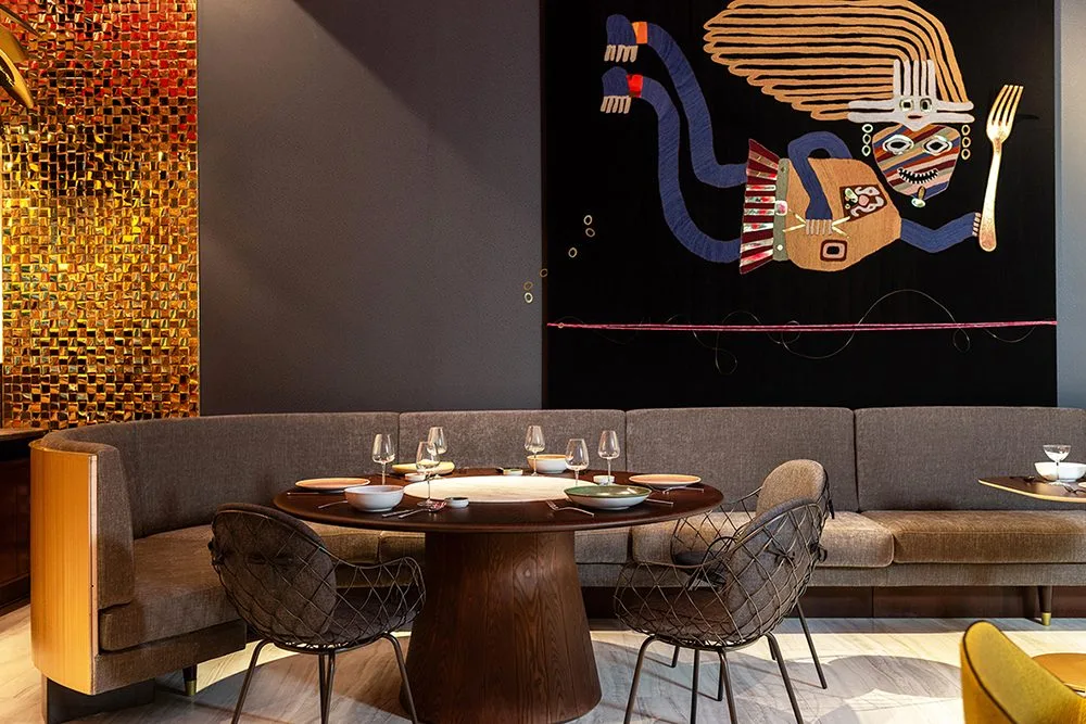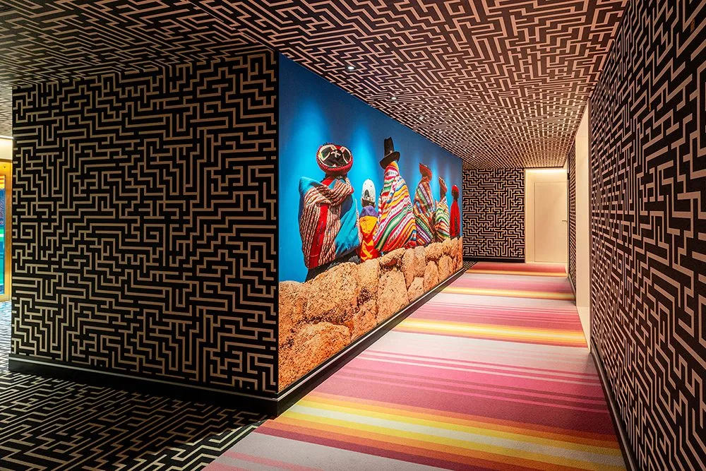 El diseño interior y la arquitectura del hotel nos hablan de su carácter narrativo. Casi poético. Desde los pasillos donde se ubican las habitaciones que recrean una especie de laberinto con motivos kené del Amazonas, hasta los muros del restaurante ingeniosamente adornados con símbolos de la cultura Paracas reinterpretados con humor, como lo es por ejemplo un dios con tenedor en su mano. En cada espacio el nhow busca dialogar y encantar al visitante.