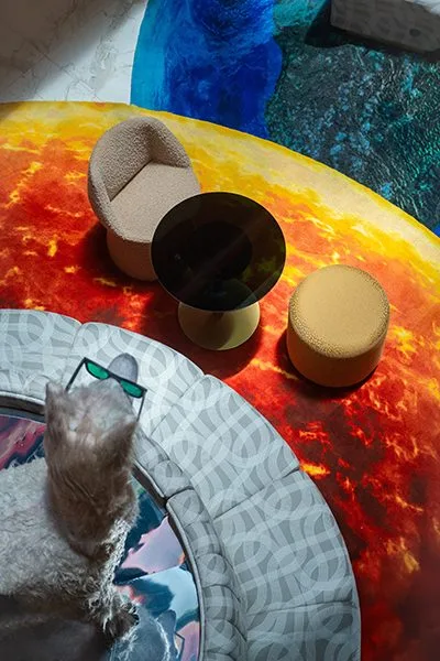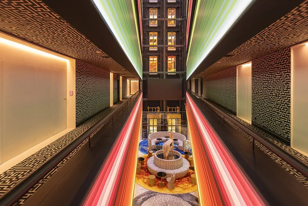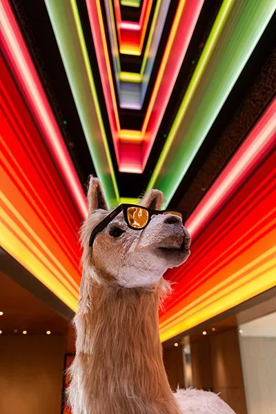 El lema de la marca es “nuevos mitos, nuevos ritos”, y aquello encuentra eco en cada uno de los rincones del edificio ubicado en pleno corazón del barrio de Miraflores, uno de los más exclusivos de Lima. Al entrar, los huéspedes se podrán encontrar en el lobby (piso 3) con un gran escudo solar con el Inti reemplazado por un emoji que da la bienvenida, mientras que cada piso se tiñe de un color diferente evocando la famosa Montaña de Siete Colores. A su vez, una curiosa llama ondera con anteojos oscuros que esconde en su interior una versión digital de sí misma, y también murales en pasillos y habitaciones inspirados en el arte shipibo-konibo de la cultura kené, dan vida a un concepto en el que la naturaleza y lo ancestral se presenta con audacia.