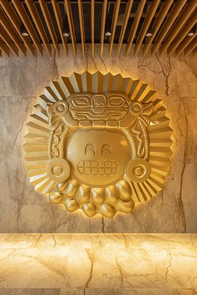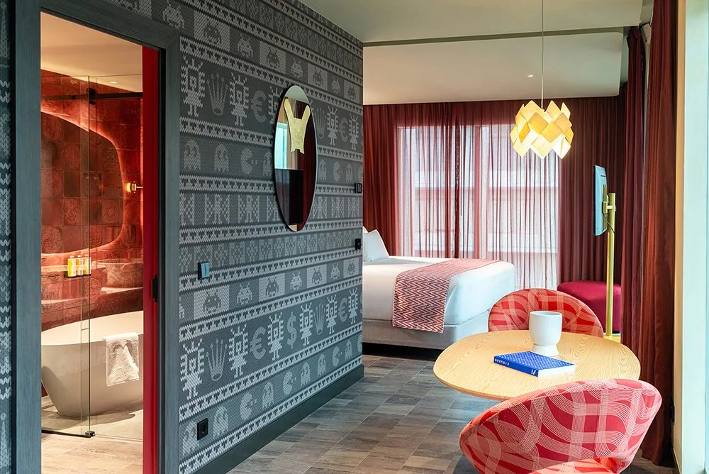 La Estela de Raimondi, un monolito ícono de la cultura Chavín, se replica en la fachada de la zona de la piscina, iluminada con tonos rojos que transforman las noches en un espectáculo visual. En las habitaciones, el diseño mantiene la línea: papeles murales que mezclan juegos arcade con figuras incas, respaldos de cama inspirados en el sitio arqueológico de Sacsayhuamán, baños de piedra rústica y detalles como cojines en forma de serpiente, símbolo del mundo subterráneo en la cosmovisión andina.