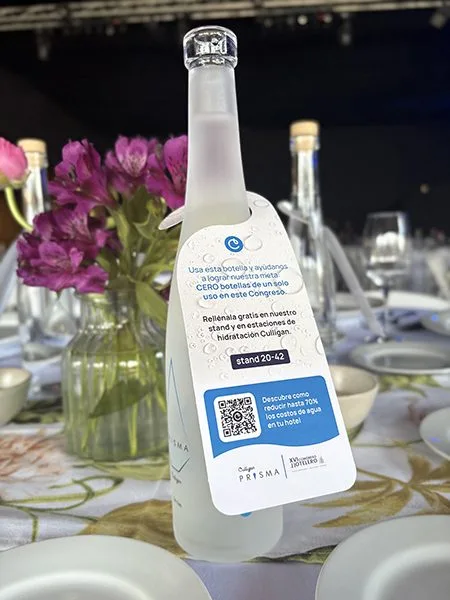 La idea nació, según relata el ejecutivo, durante la preparación del Congreso. “Nos preguntamos por qué no tomar este evento como si fuera un hotel gigante. Entonces, creamos un símbolo: una botella diseñada para la ocasión, por supuesto, con el branding de Culligan y también del Congreso, acompañada de puntos de rellenado y un collarín que evoca el diseño de las habitaciones”, detalla Pérez de Castro, describiendo este complemento gracias al que cada usuario pudo, además, conocer la meta de cero botellas en el evento gremial.